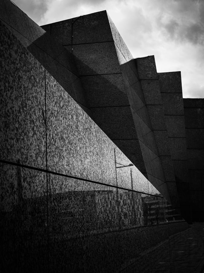 This is an alternate view of the front of the entrance area to the only zoo in Bremerhaven for sea animals. Black&white abstract style emphasizing the odd but still modern design of the building, which was opened in 1928.