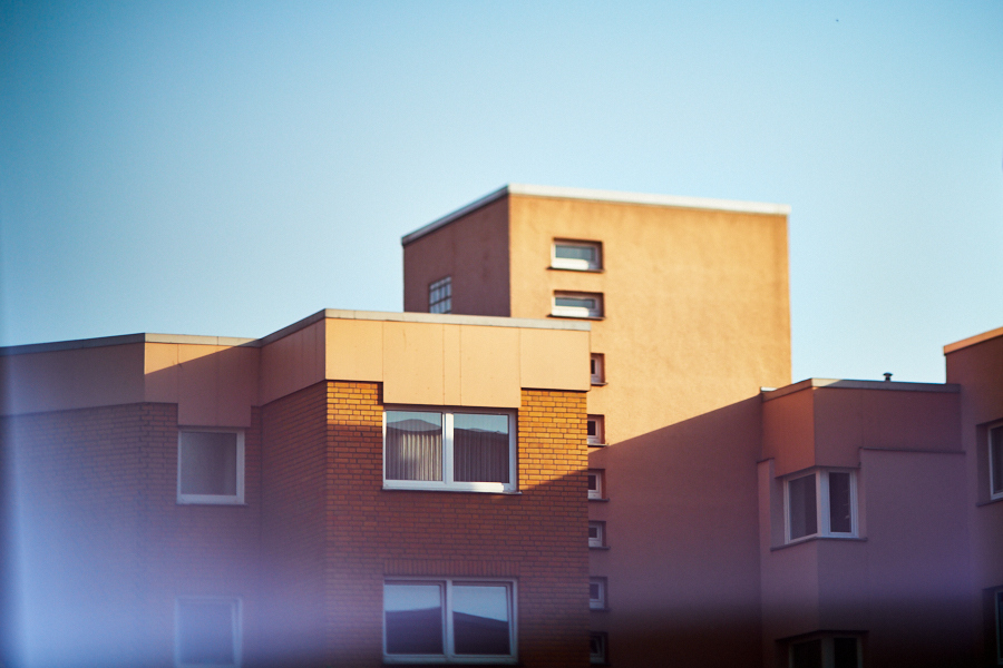 Odd, miniature like looking buildings on a sunny afternoon. A blue sky compliments this unsusual and artistic architectural image.