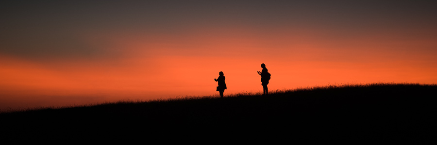Two women standing and looking at their cellphones during sunset, with the red fiery sky behind them.