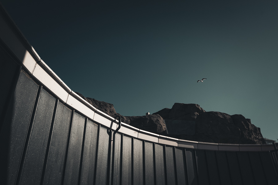 An almost surreal image with a metal wall behind the zoo "Zoo am Meer" in Bremerhaven, Germany. A seagull can be seen dominating the unusual colored sky above, which are fairly common as they seem to own the place. With enough wind they can be seen hovering a few meters above people to seize their chance at some food which they will pick out of somebody's hand.