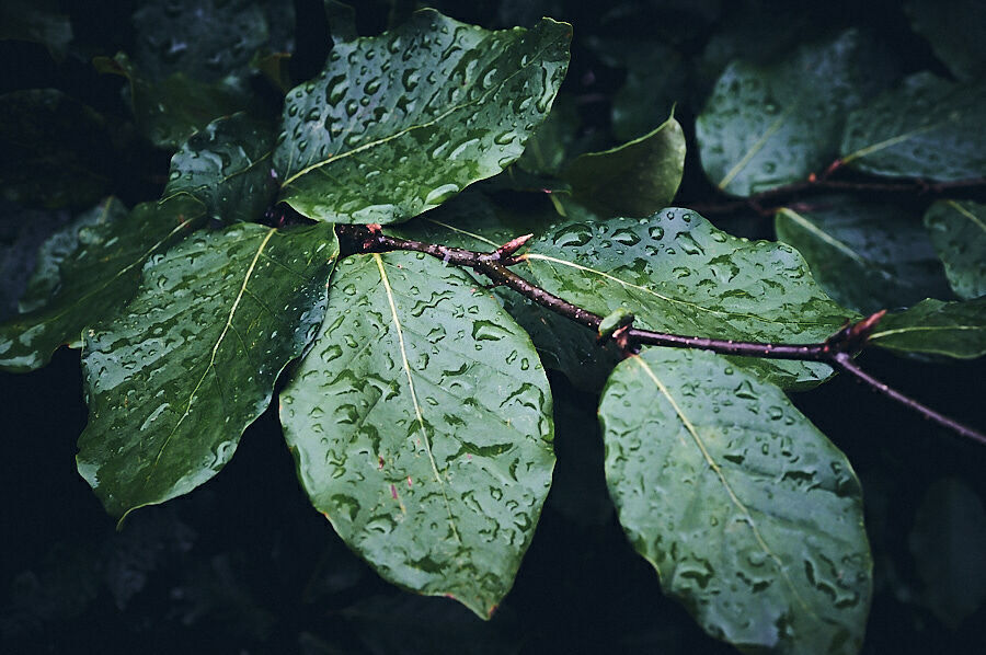 Close-up of raindrops on green leaves during a rain, showcasing the beauty of nature in its natural state. The blue-ish green and wet background adds to the serene mood of the image.