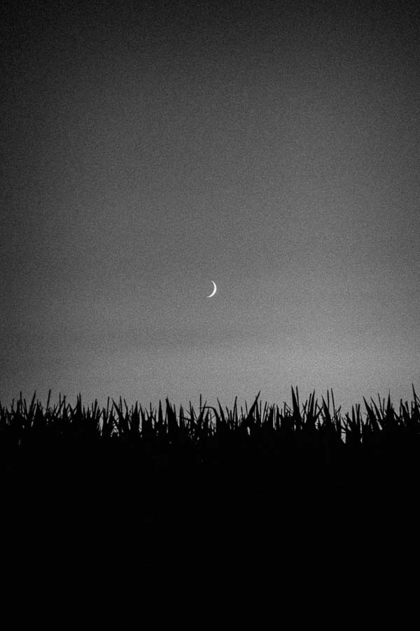 Captured in the tranquil moments after sunset, this minimalist digital photo showcases a breathtaking crescent moon hovering over a dark maize field in the foreground. The cloudless red fiery sky adds a dramatic touch to the scene, as it transitions into the approaching blue hour. Perfect for printing, this stunning image captures the essence of nature's beauty and is sure to leave a lasting impression on any viewer.