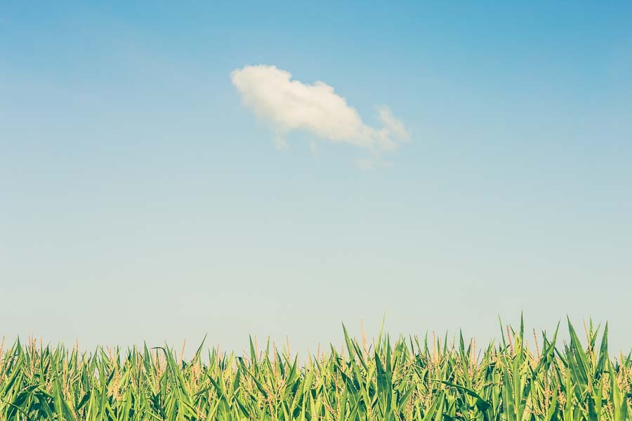 Captivating digital photo of a single slanted white cloud majestically hovering over a vibrant green maize field, with its sharp leafs that appear to be reaching towards the clear blue sky in bright afternoon sunlight. This minimalistic image is perfect for printing and will add a touch of natural beauty to any space.