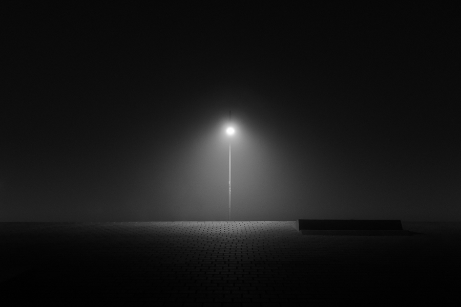 A very minimalist and abstract image of a simple lamppost at night, illuminating a concrete platform on a dike in the city of Bremerhaven, Germany. The foggy atmosphere and its simplicity make this great wall art, when printed.